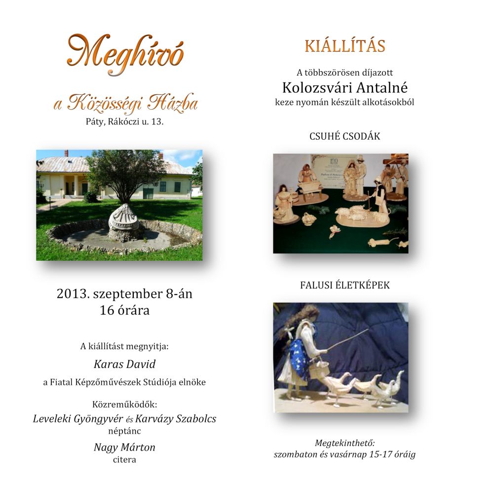 Egy alföldi kis faluban születtem. Szüleim földművesek voltak, így már gyermekkoromban találkoztam a kukoricával és az állatokkal. 1967-ben költöztünk Pátyra. 3 gyerekem és 7 unokám van. A 90-es években gyakran nálam voltak az unokák és sokat kézműveskedtünk, varrtunk, rajzoltunk, gyurmáztunk. Mindig szerettem a természetes anyagokat, így került sor a csuhébabázásra, ami a gyerekkorom játékait idézte. Megszerettem a csuhézást és elkezdtem különböző figurákat készíteni. 1997-ben vettem részt az első Ügyes kezek kiállításon a Pátyi Közösségi Házban. 2005-ben neveztem be a Betlehemi jászol országos kiállításra, amit „A Magyar Kézművességért Alapítvány” szervez. Azóta minden évben jelentkezem alkotásaimmal, amik többször díjazottak lettek. 2010-ben a Rómában évente megrendezésre kerülő „100 jászol” nemzetközi kiállításon szerepelt az egyik díjazott alkotásom. Az első időben családom és magam örömére készítettem a figurákat. Később azonban a kezdeti sikereken felbuzdulva szívesen mutattam meg, adtam át másoknak is a tudásomat, egyebek között falunapokon, vagy a Közösségi házban szervezett kézműves foglalkozásokon. Életem szerves része lett a csuhébabázás, unokáim mellett ez kedvenc időtöltésem. Szeretem megörökíteni a falusi emberek hétköznapjait, így készítettem már többek között kaszáló férfit, mosónőt és tyúkokat etető asszonyt. Mindemellett modern figurákat is készítek, például balettozó lányt. Minden évben örömet okoz egy-egy betlehem megalkotása, mely nagyon sokrétű, hiszen a figurák mellett az istállót és az állatokat is el kell készíteni és izgalmas kihívás évről évre valami újjal és különlegessel előrukkolni ugyanabban a témában.